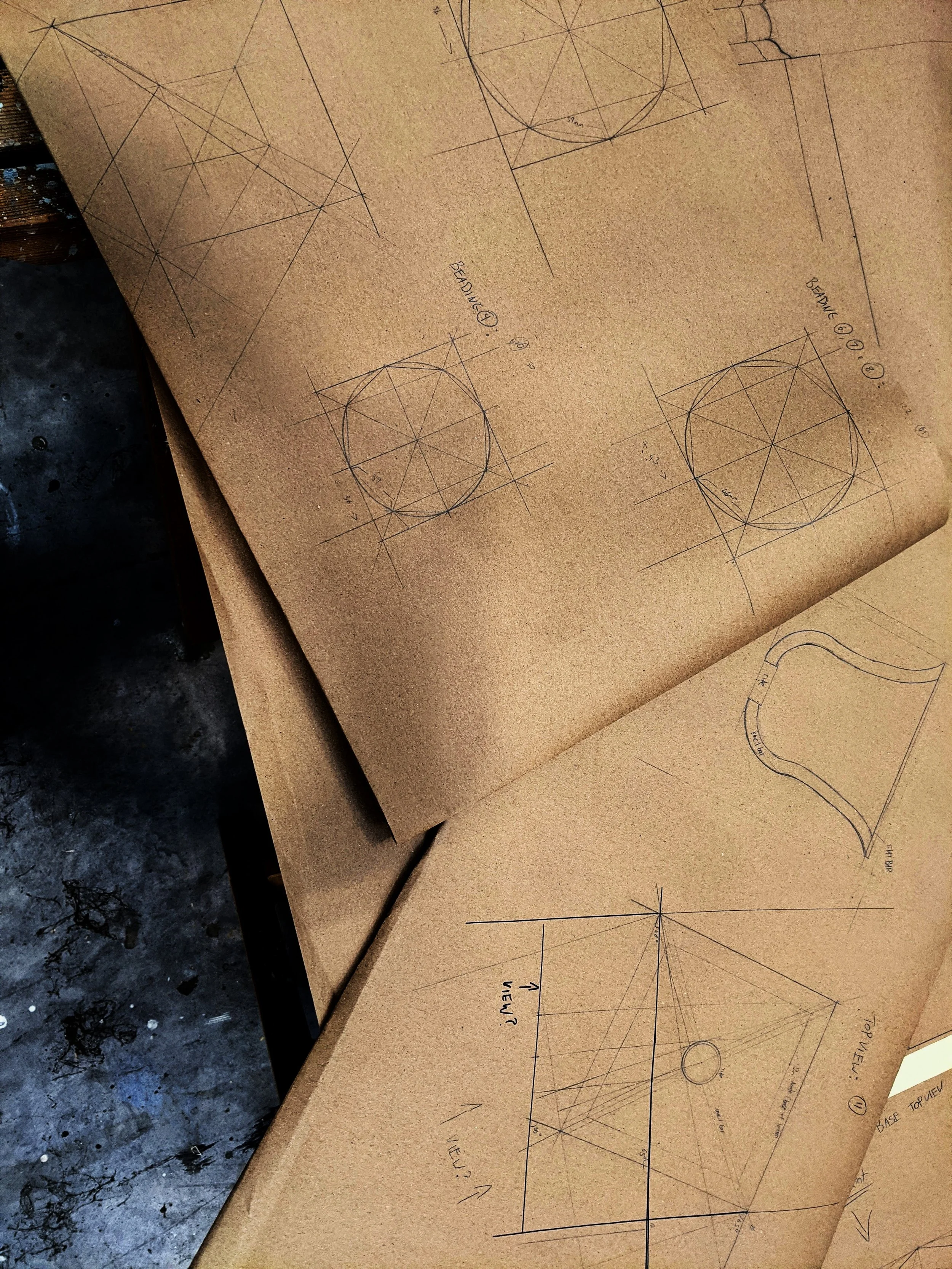 Drawn up and projected at 1:1 scale from 1:25 2d card model. Tapered steel tube formed the inner structure. Foundation surround made from birch ply(panelling and routed octagons) and timber moulding.